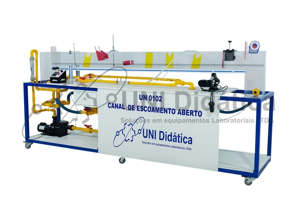 A bancada UN 0502 é composta pelos os seguintes componentes; Canal de escoamento aberto de 3 m, contendo limnímetro, para medida do nível da superfície líquida, tubo de Pitot com tomadas de pressão...